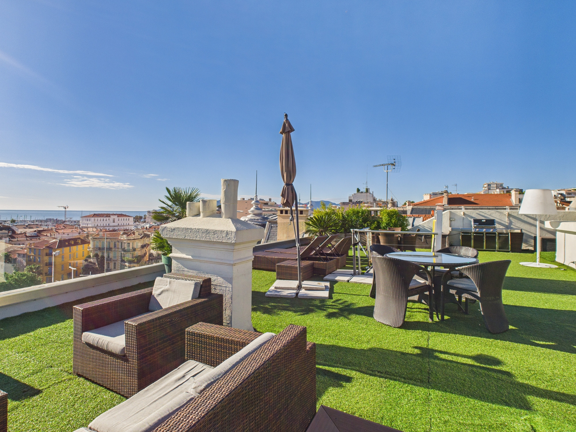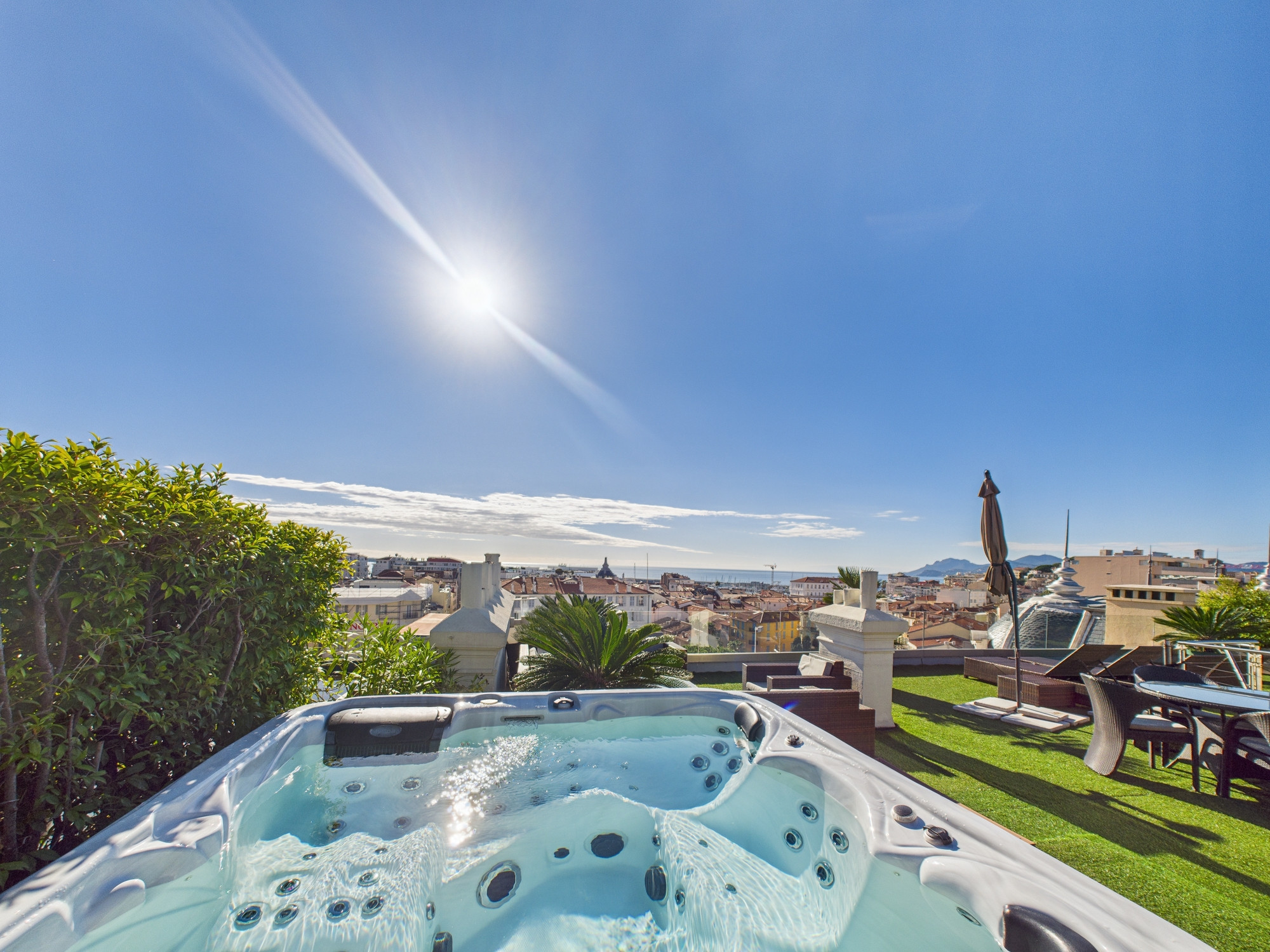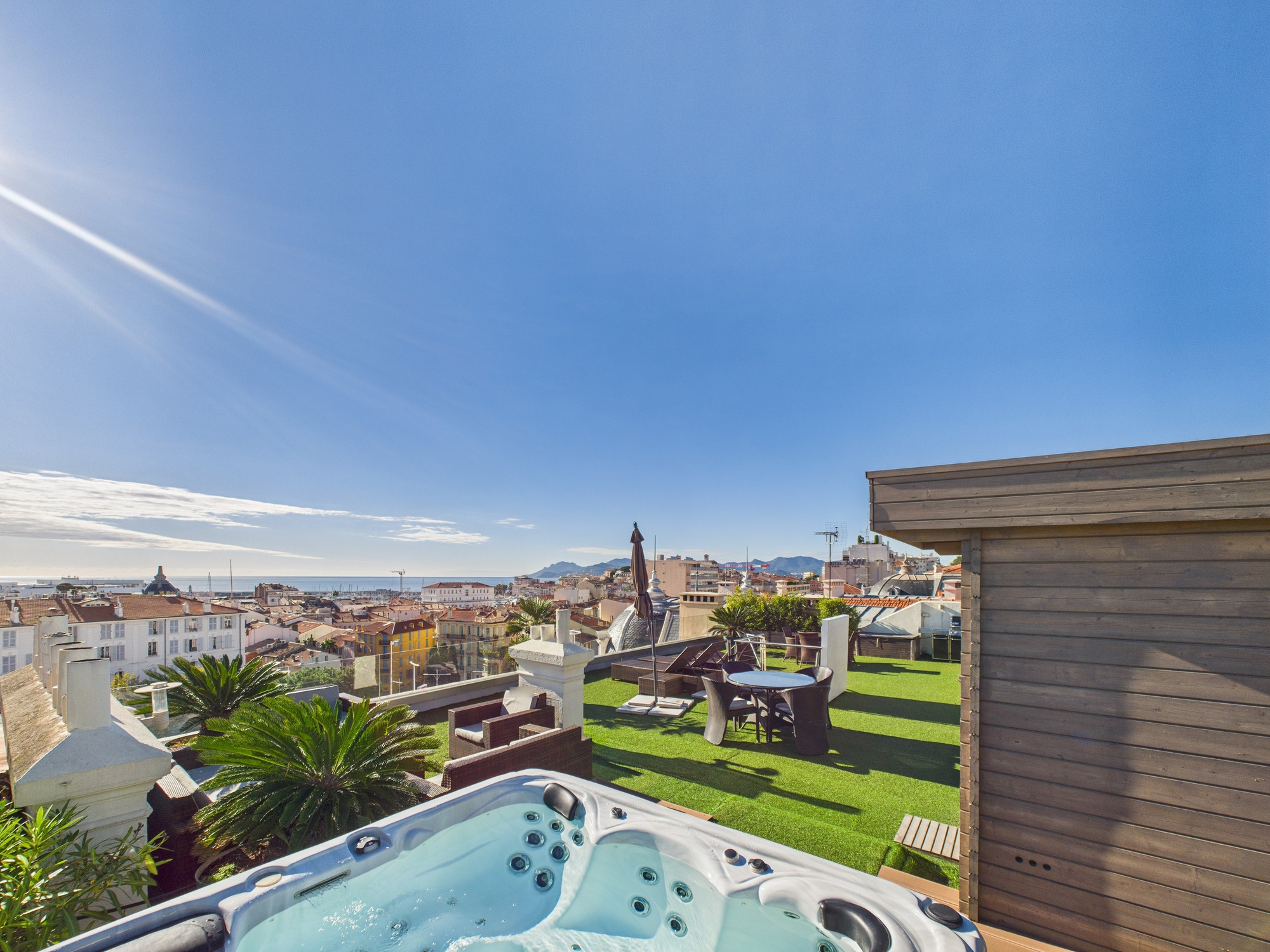 Profitez du jacuzzi, du sauna et du barbecue sous le soleil éclatant de Cannes, avec une vue imprenable sur la mer. Cette terrasse de 150 m² est une escapade de rêve.