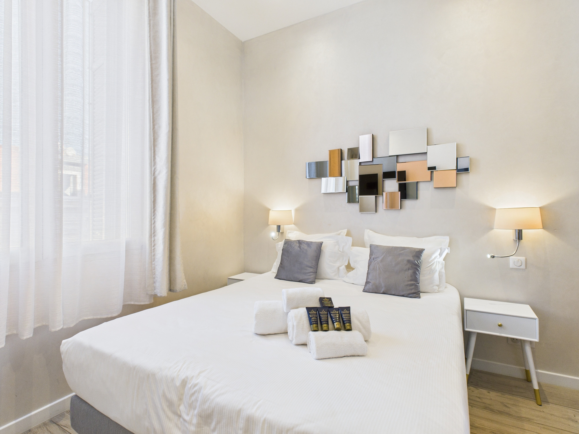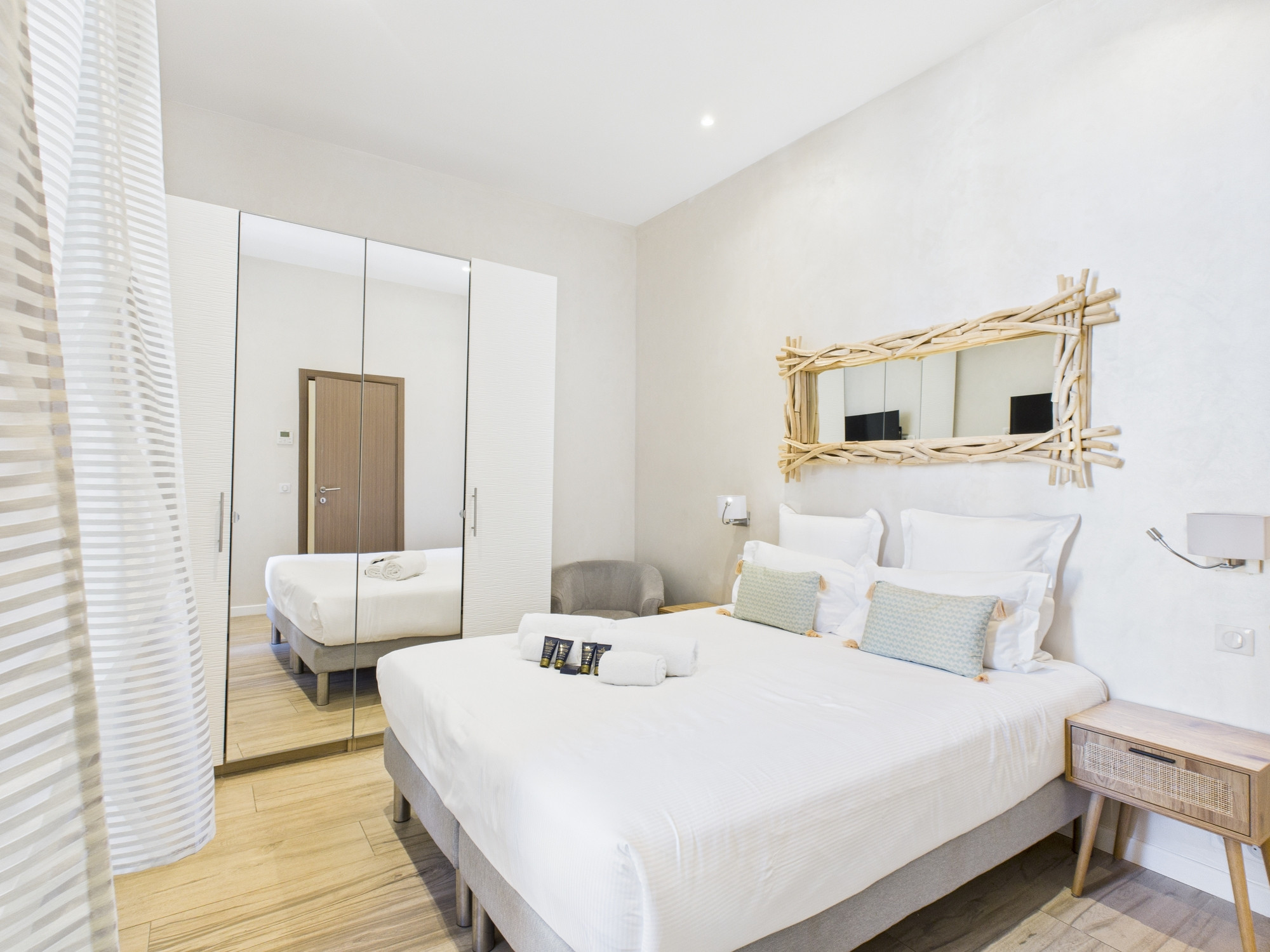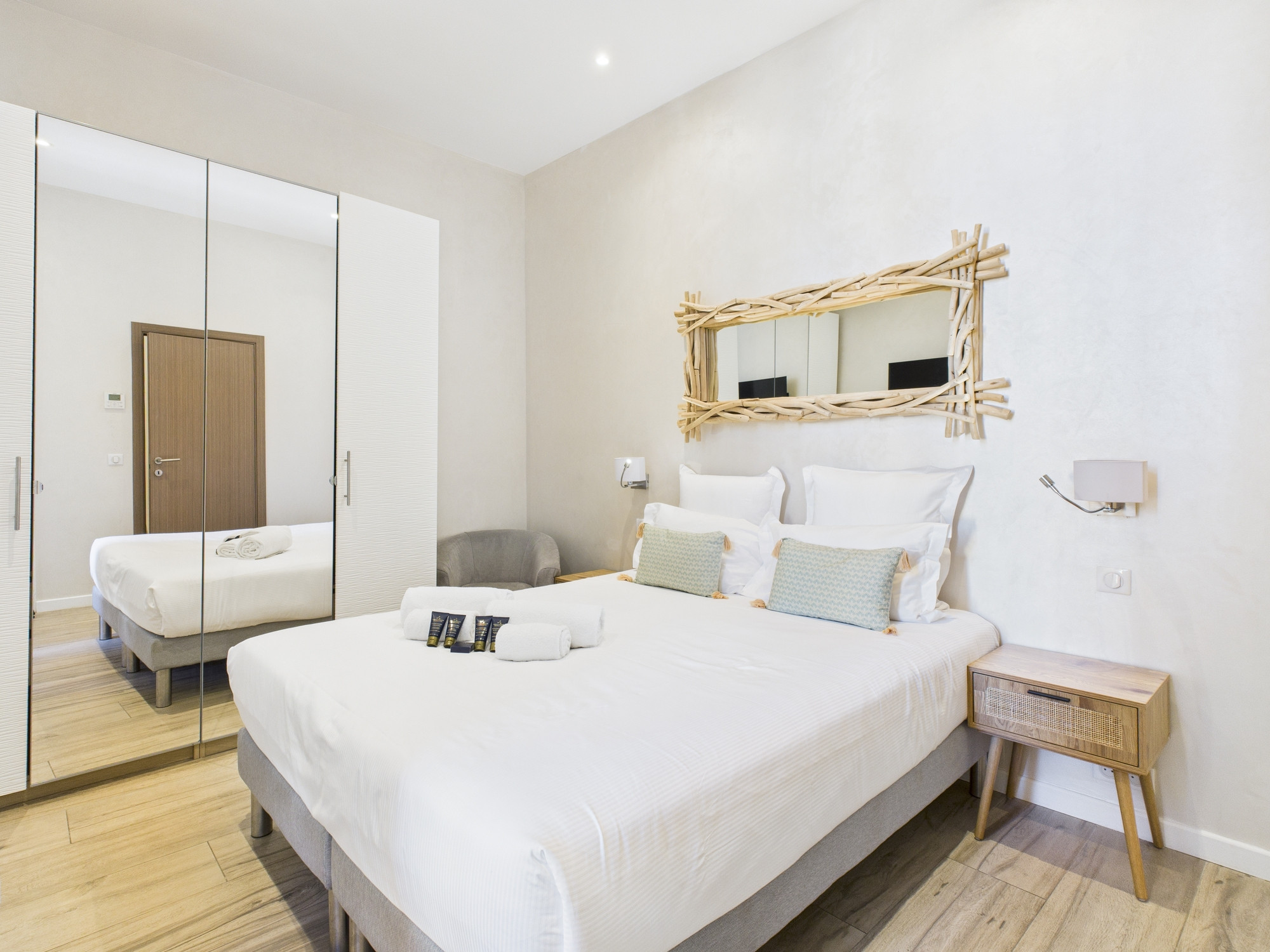 L'appartement Skandi incarne le raffinement et le confort. Avec ses 4 chambres, 4 salles de bain, dont une baignoire balnéo design, cet espace contemporain et lumineux offre une vue sur le centre de Cannes. Doté de hauts plafonds, il crée une atmosphère chaleureuse et sereine.